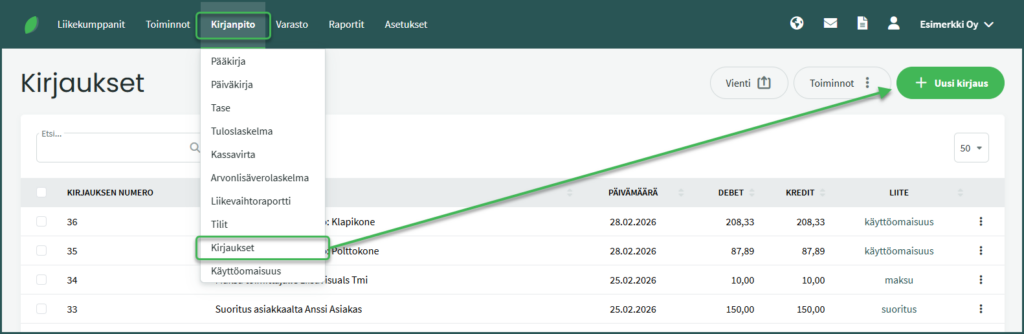 💡 Vinkki: Kun teet samanlaisen kirjauksen uudelleen, avaa aiemmin luotu kirjaus kohdasta Kirjanpito > Kirjaukset. Valitse kirjauksen näkymässä oikealta Toiminnot > Kopioi kirjaus. Ohjelma kopioi kirjauksen, jolloin sinun tarvitsee muuttaa vain vain osaa kentistä.