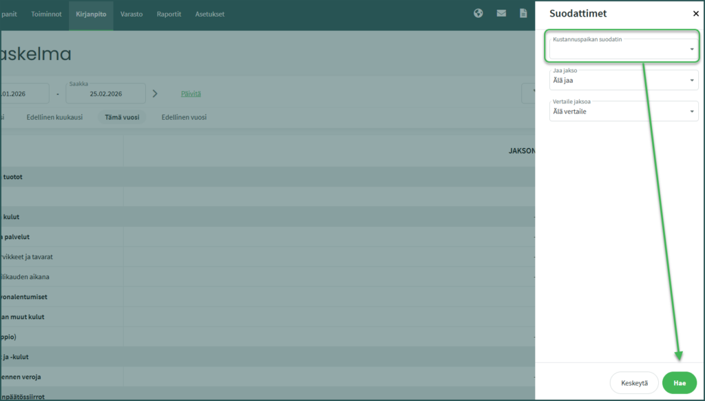 Ohjelmassa on erillinen kustannuspaikkaraportti, minkä lisäksi voit suodattaa kustannuspaikan mukaan esimerkiksi tuloslaskelman ja taseen. 1. Kustannuspaikkaraportin saat haettua kohdasta Raportit > Kustannuspaikkaraportti. 2. Valitse haluamasi ajanjakso ja kustannuspaikka. 3. Raportti kuvaa valitulle kustannuspaikalle kohdistettuja tuloja ja menoja. 4. Muilla raporteilla kustannuspaikan suodatin löytyy raportin sivun Suodattimet-kohdasta.