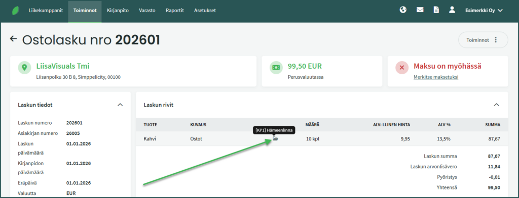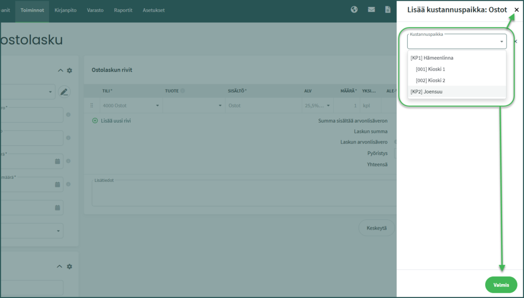 Ennen kuin voit lisätä laskulle kustannuspaikkoja, tulee sinun on perustaa kustannuspaikat ohjelmaan. Katso ohje kustannuspaikkojen lisäämiseen täältä.