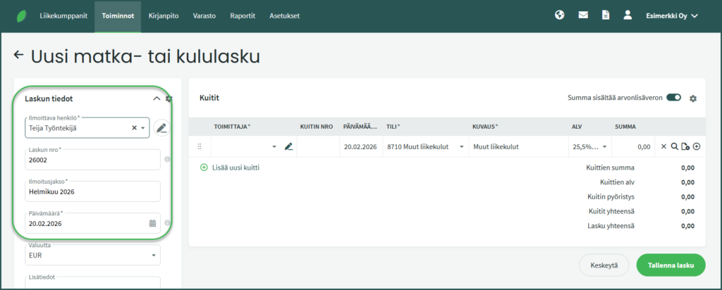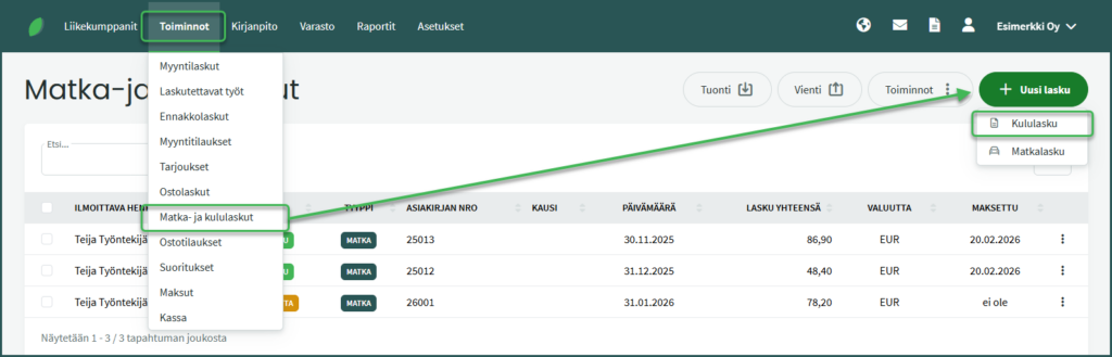 1. Kululasku tehdään kohdassa Toiminnot > Matka- ja kululaskut > Uusi lasku > Kululasku.