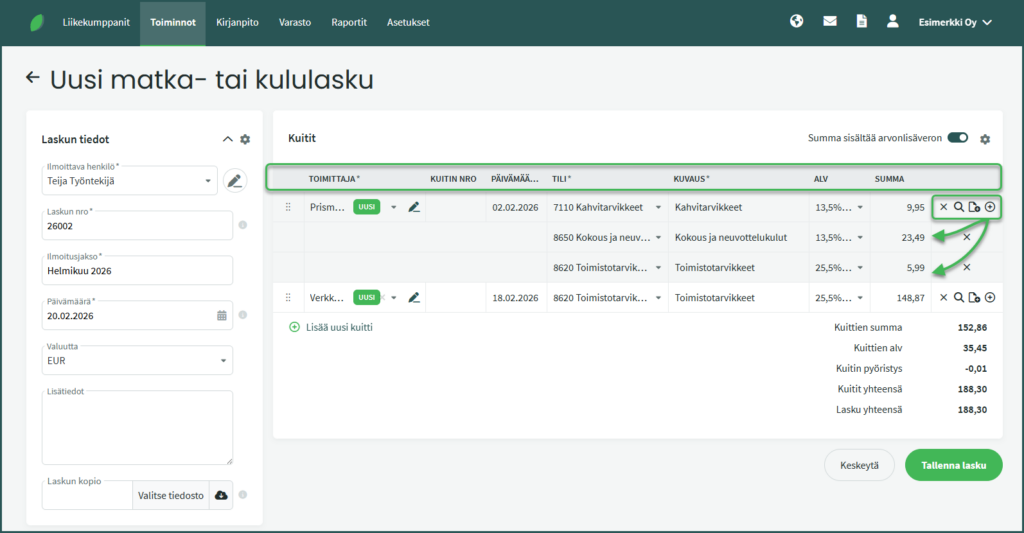 Rivin lopussa olevista kuvakkeista voit poistaa kuitin, lisätä kuitille lisärivejä (esimerkiksi silloin, kun samalla kuitilla on useita ALV-kantoja), tarkastella summien erittelyä sekä lisätä kuittiriville liitteitä, kuten kuittikopion.