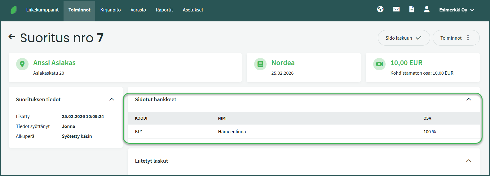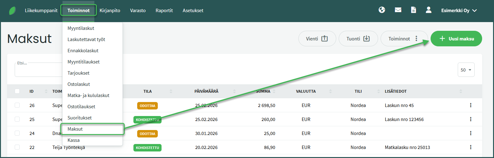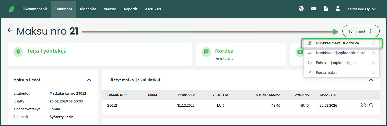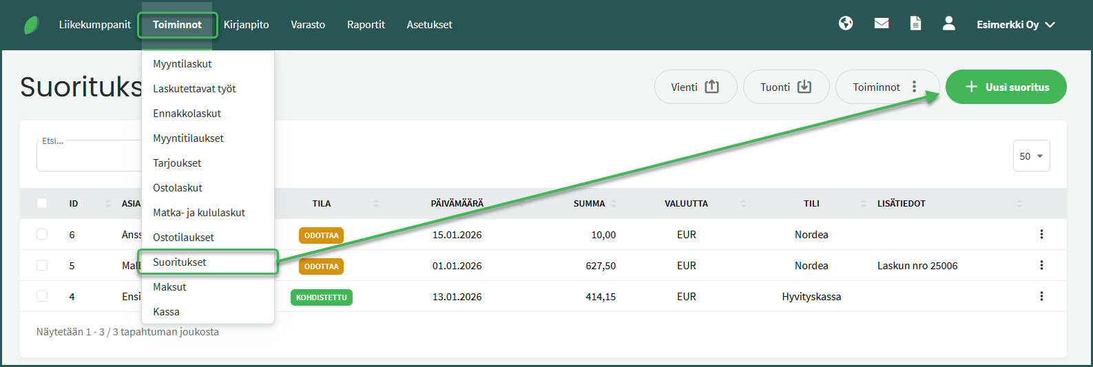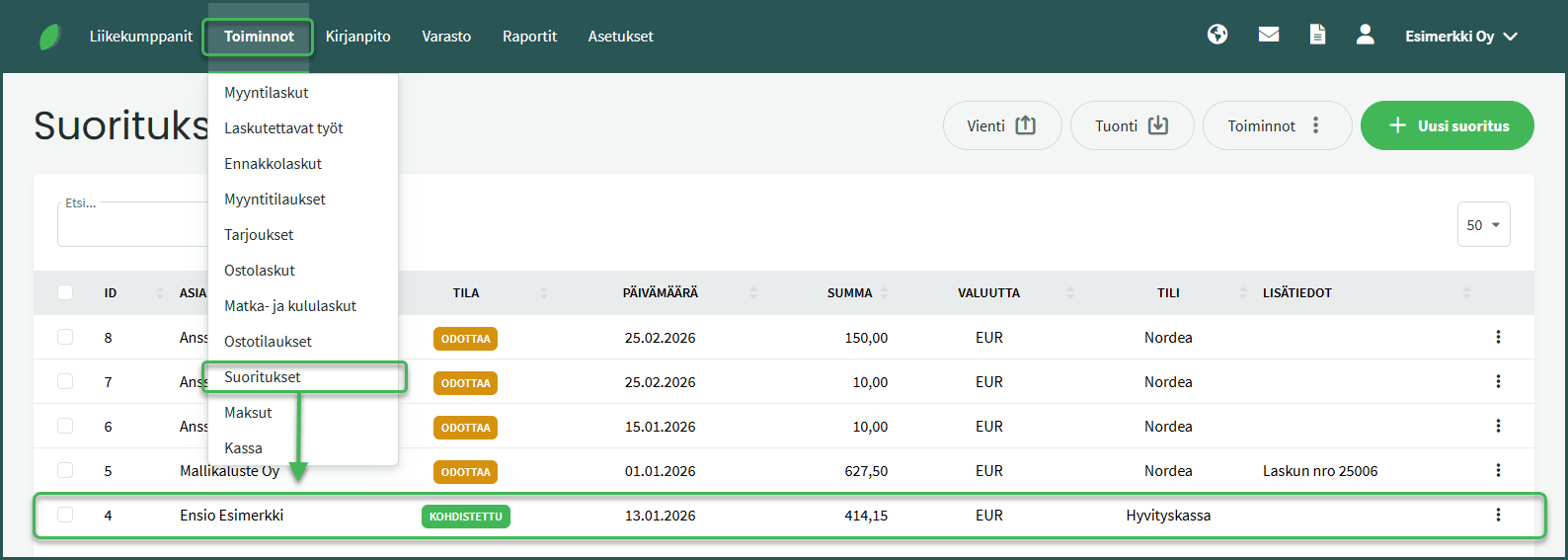 - Pankkiyhteyden kautta tulevia suorituksia voi muokata kohdassa Toiminnot > Suoritukset tai Maksut. Valitse haluamasi suoritus/maksu ja muokkaa.