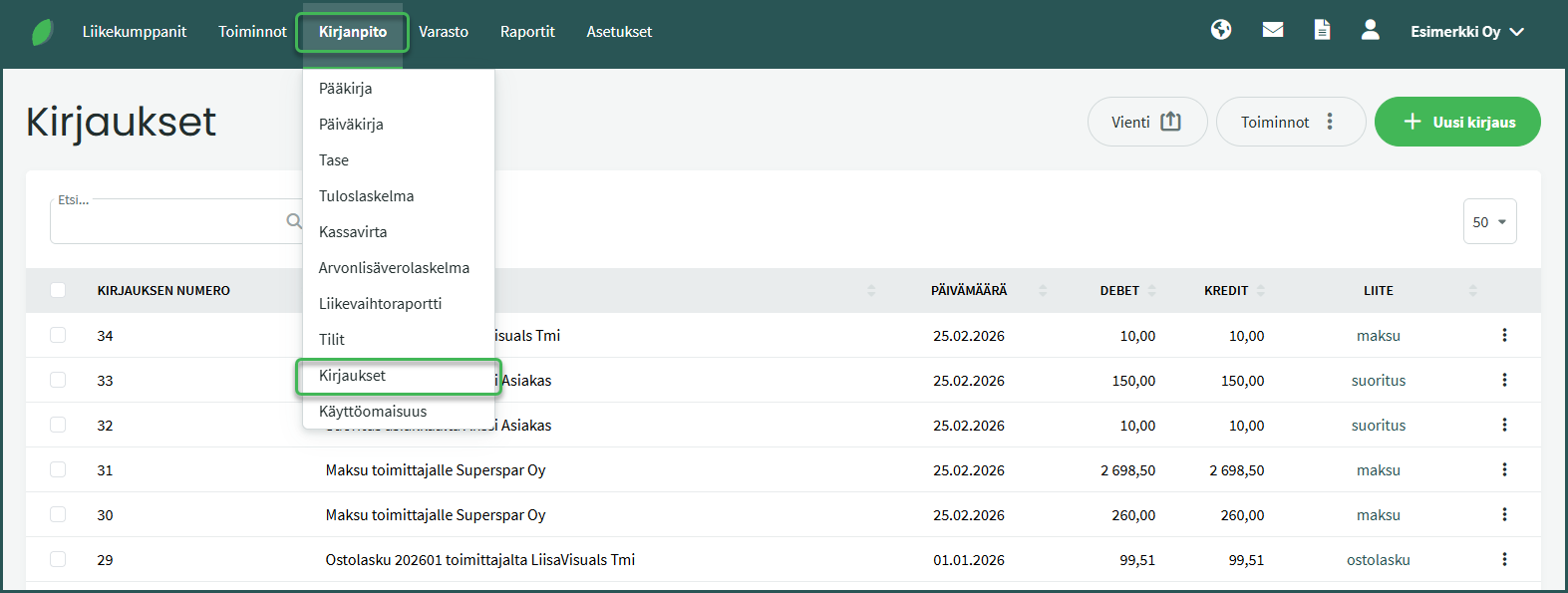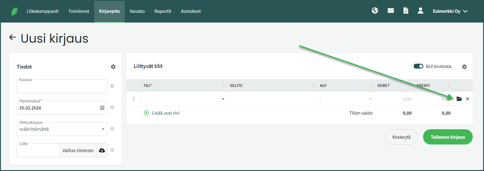 Kirjanpidon kirjauksia lisätään kohdasta Kirjanpito > Kirjaukset. Kustannuspaikka lisätään kirjauksen rivin lopussa olevasta kansio-kuvakkeesta samaan tapaan kuin laskuille.
