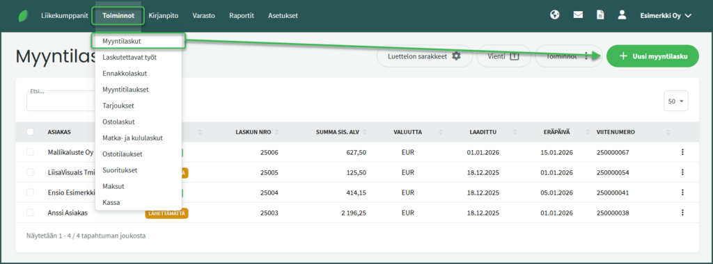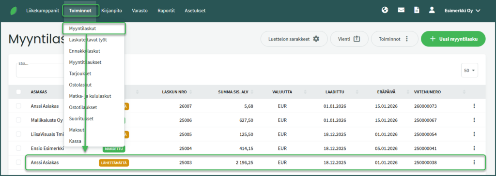 1. Avaa olemassa oleva myyntilasku klikkaamalla kohdasta Toiminnot > Myyntilaskut