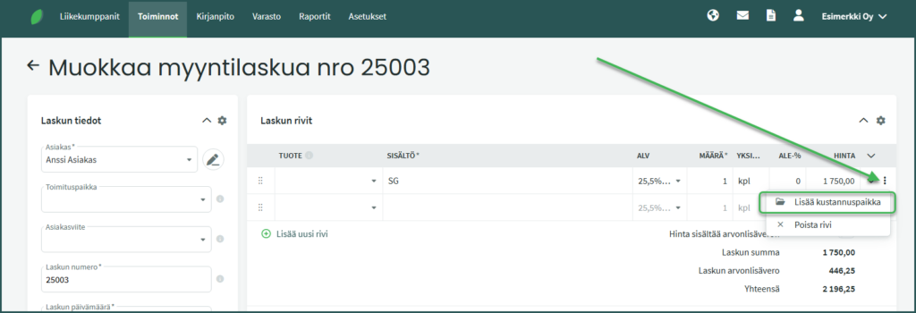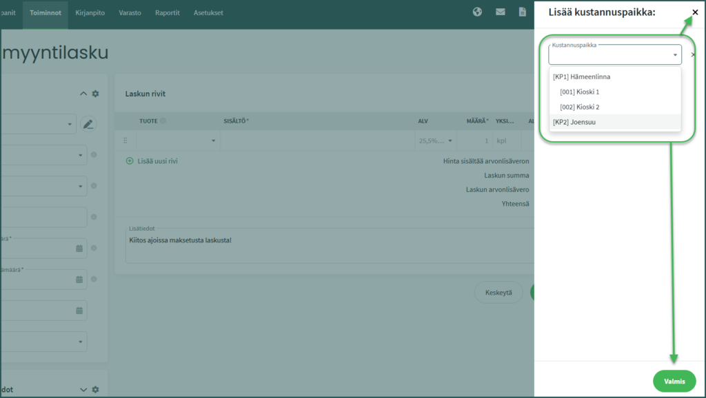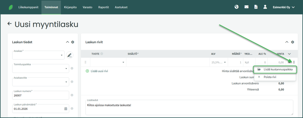 1. Lisää kustannuspaikka uudelle myyntilaskulle kohdasta Toiminnot > Myyntilaskut > Uusi myyntilasku