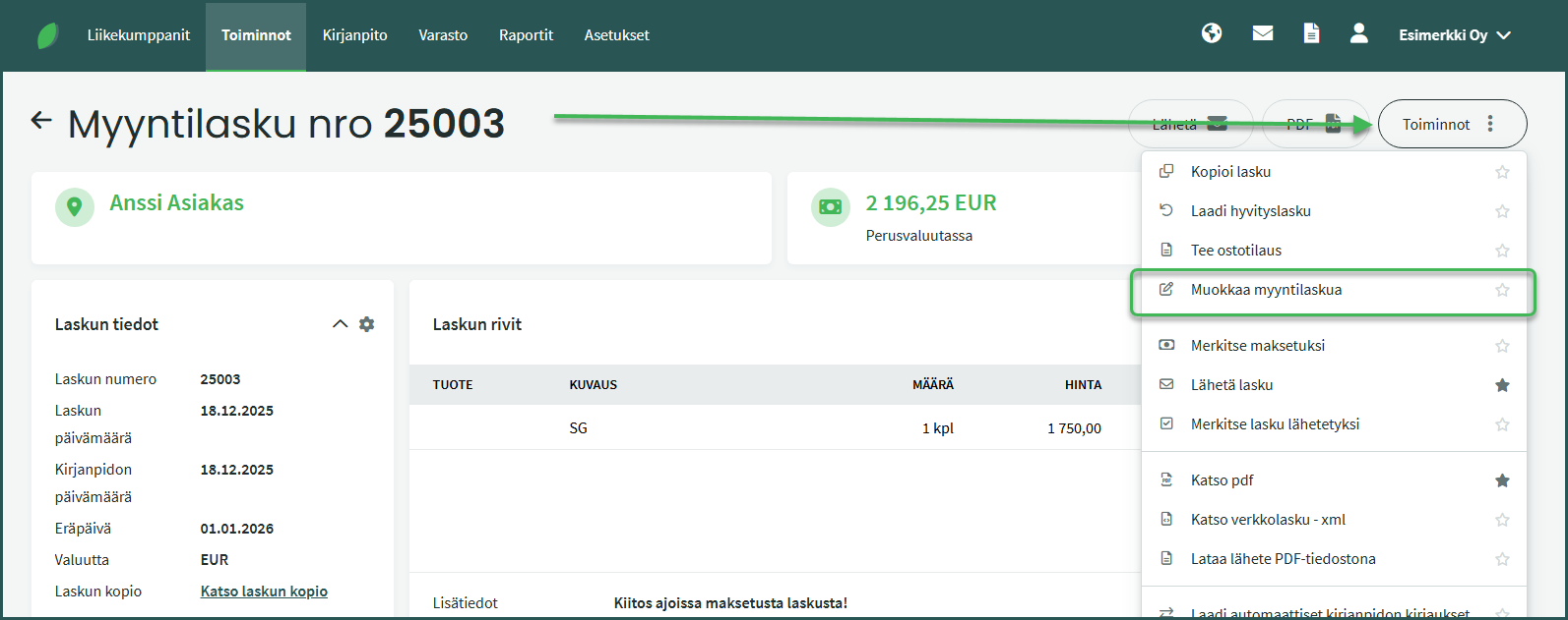 2. Valitse oikeasta reunasta Toiminnot > Muokkaa myyntilaskua