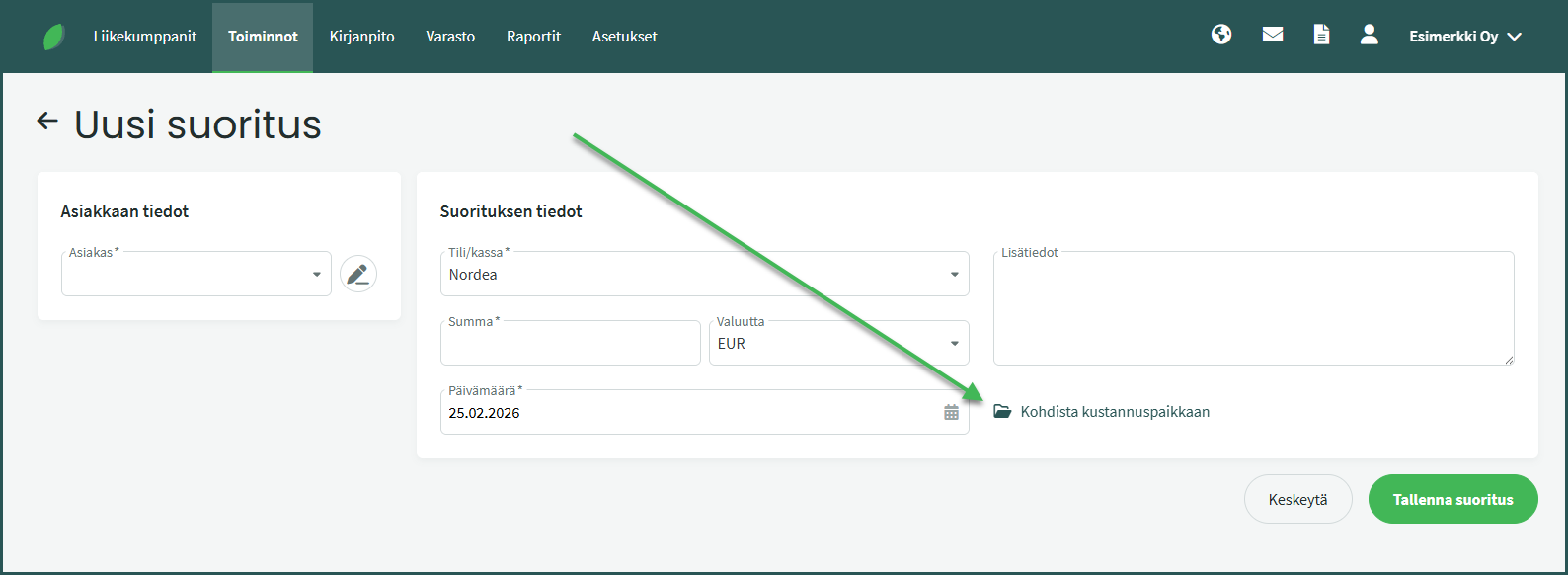 Jos lisäät maksun tai suorituksen ensin ohjelmaan pankkiyhteyden kautta tai käsin, tulee kustannuspaikka lisätä maksulle/suoritukselle itse.