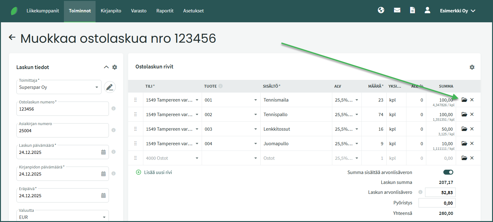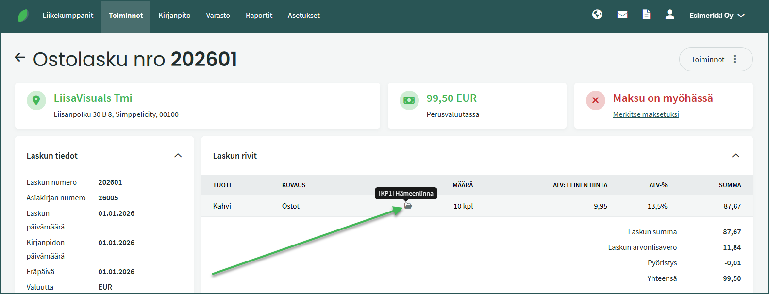 5. Kun laskulle on lisätty kustannuspaikka ja lasku on tallennettu, rivin sisällön yhteydessä näkyy kansiokuvake.