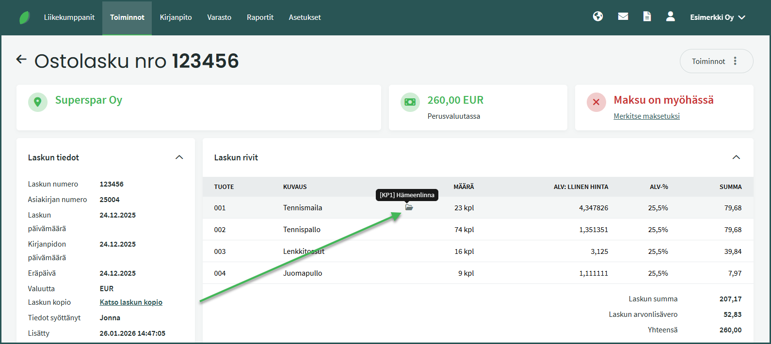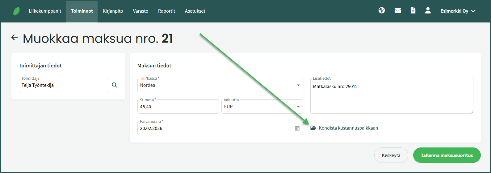 Jos merkitset laskun maksetuksi laskun kautta (avaa haluamasi lasku ja valitse oikealta “Merkitse maksetuksi”), ohjelma liittää maksulle/suoritukselle automaattisesti saman kustannuspaikan kuin laskulla.