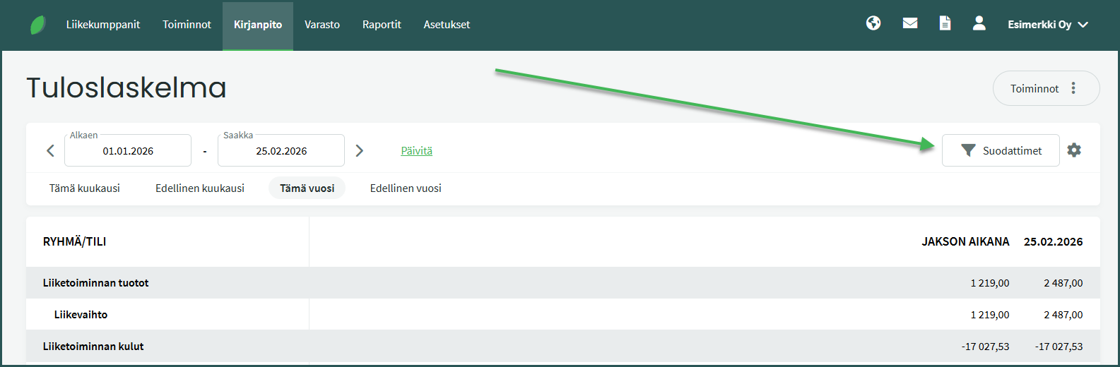 Ohjelmassa on erillinen kustannuspaikkaraportti, minkä lisäksi voit suodattaa kustannuspaikan mukaan esimerkiksi tuloslaskelman ja taseen.