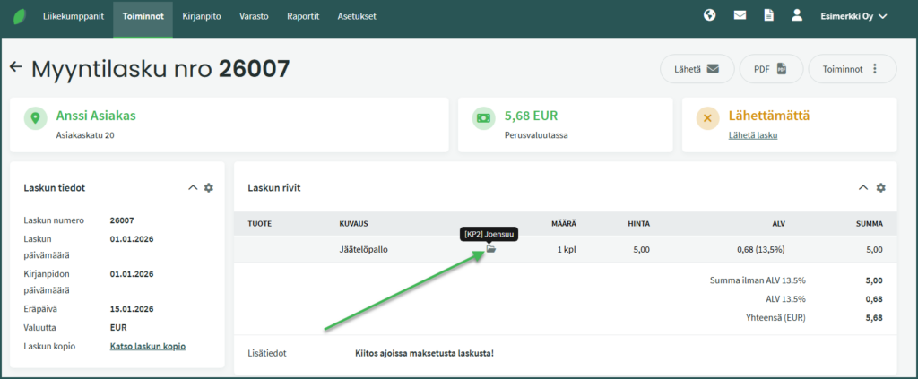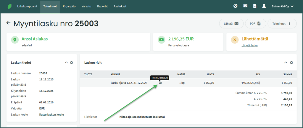 HUOM: Kun olet muokannut suoritusta tai maksua, se tulee liittää laskuun uudelleen.