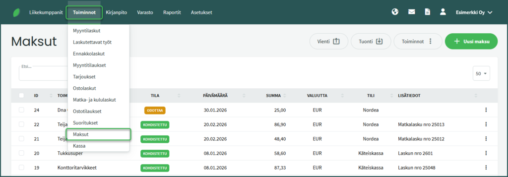 1. Maksuja käsitellään kohdassa Toiminnot > Maksut.