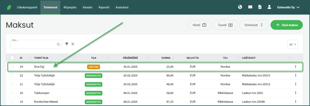 Maksun voi lisätä ohjelmaan joko tiliotteen tuonnin yhteydessä (ohje) tai merkitsemällä ostolaskun maksetuksi (ohje).