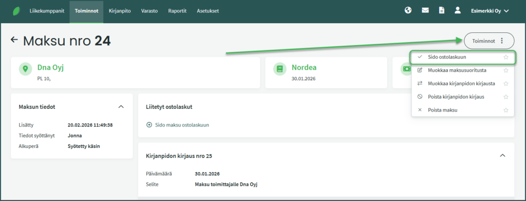 3. Valitse oikean reunan Toiminnot-valikosta “Sido ostolaskuun”.