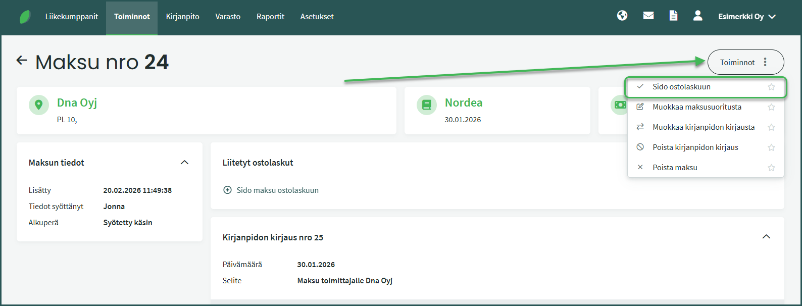 3. Valitse oikean reunan Toiminnot-valikosta “Sido ostolaskuun”.