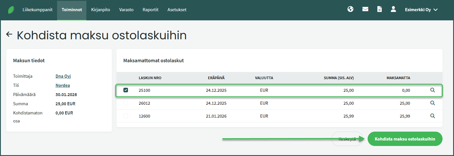 Tässä ohjeessa kerrotaan, miten kohdistat maksun ostolaskuun.