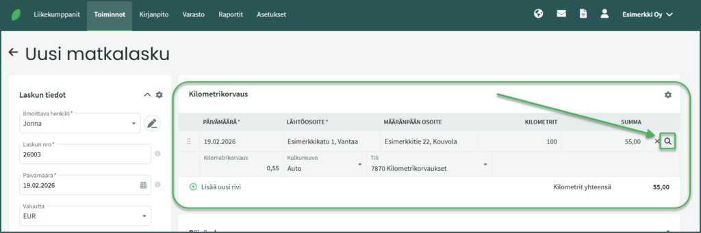 Lisää matkalaskulle päivämäärä, lähtöosoite, määränpään osoite sekä kilometrimäärä.