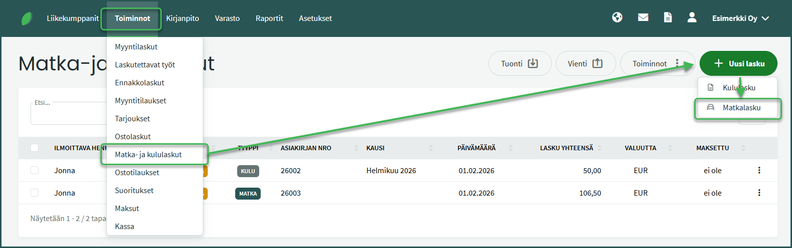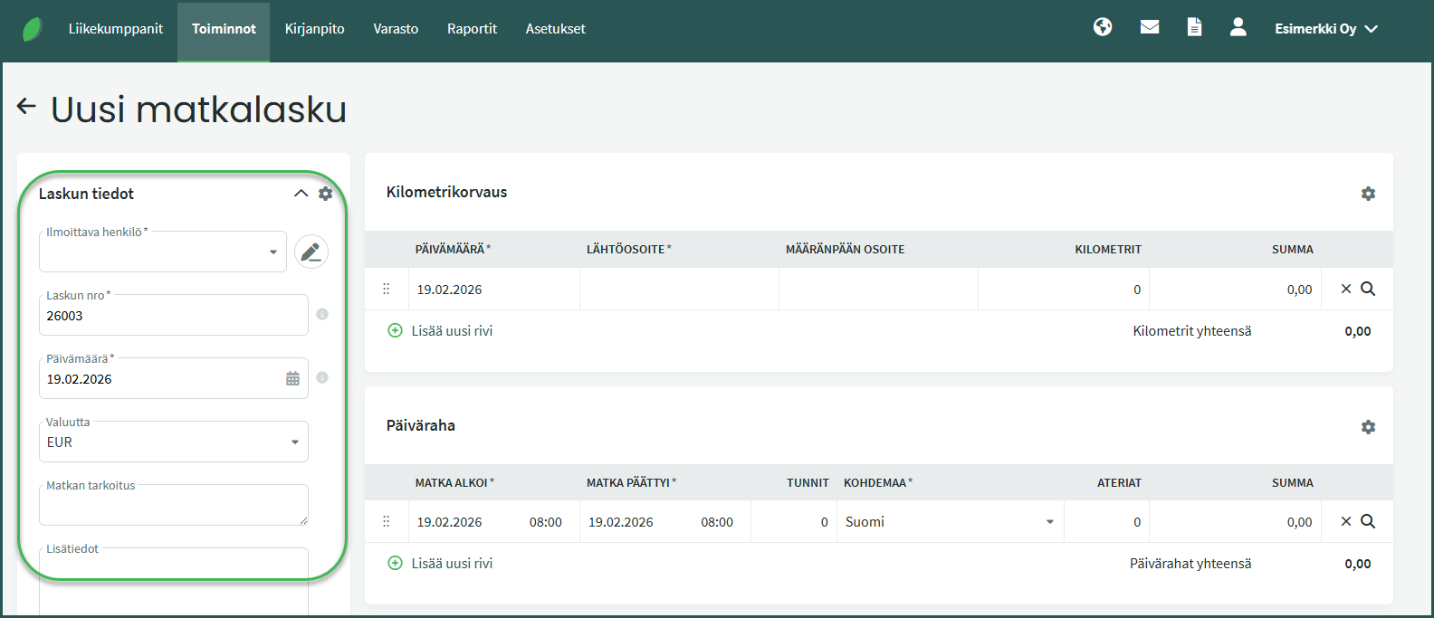 - Luo uusi matkalasku kohdasta Toiminnot > Matka- ja kululaskut > Uusi lasku > Matkalasku.