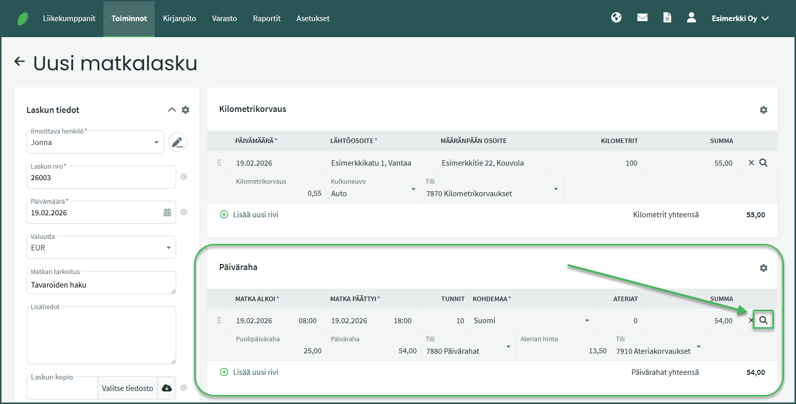 - Lisää laskulle tarvittavat tiedot: kilometrikorvaukset, päivärahat, aterioiden määrä ja/tai kuitit.
