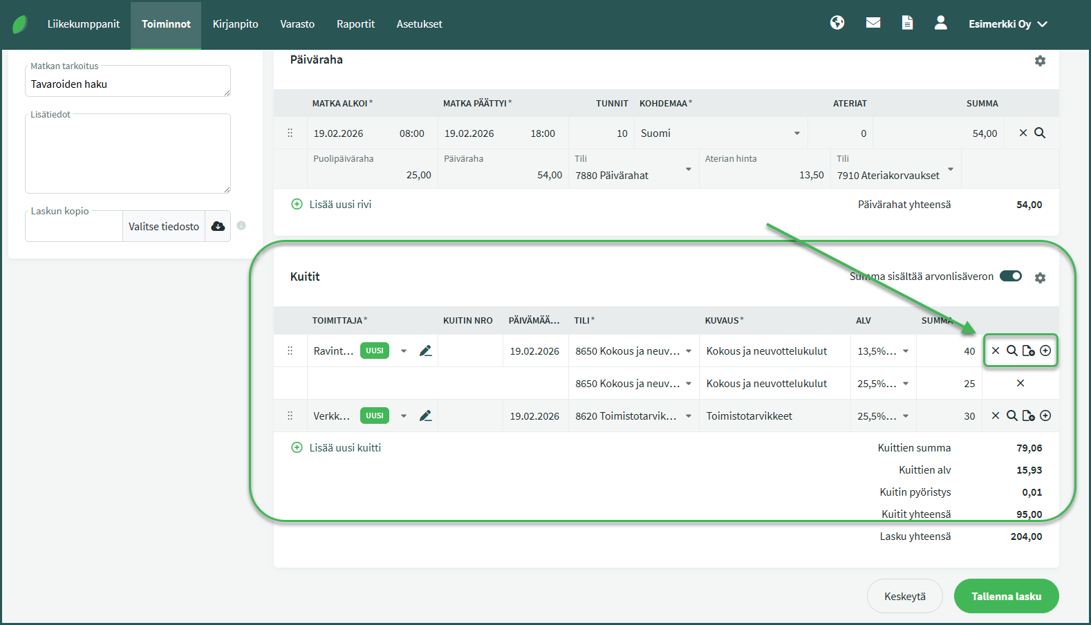 Rivin lopussa olevista kuvakkeista voit poistaa kuitin, lisätä kuitille lisärivejä (esimerkiksi silloin, kun samalla kuitilla on useita ALV-kantoja), tarkastella summien erittelyä sekä lisätä kuittiriville liitteitä, kuten kuittikopion.