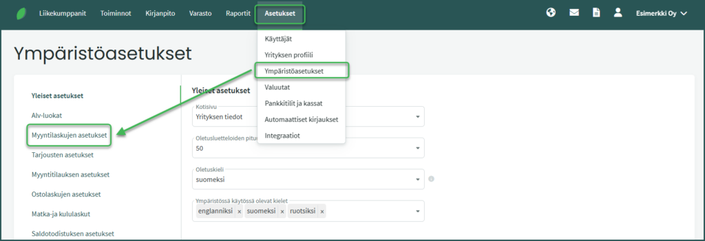 - Mene kohtaan Asetukset > Ympäristöasetukset > Myyntilaskujen asetukset.
