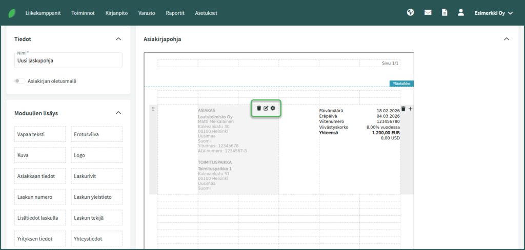 4. Klikkaamalla elementtiä saat näkyviin valikon, josta voit muokata sen sisältöä ja muotoilua tai poistaa sen laskupohjalta.