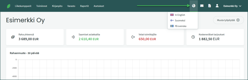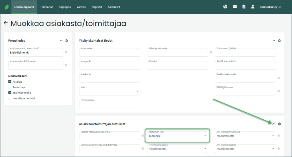 • Asiakkaan kieliasetus – Sinun ei tarvitse vaihtaa koko käyttöympäristön kieltä lähettääksesi esimerkiksi asiakkaalle englanninkielisen myyntilaskun. Voit määrittää yksittäiselle asiakkaalle kielen kohdassa Liikekumppanit > Asiakkaat ja Toimittajat > Valitse asiakas > “Muokkaa asiakasta/toimittajaa“.