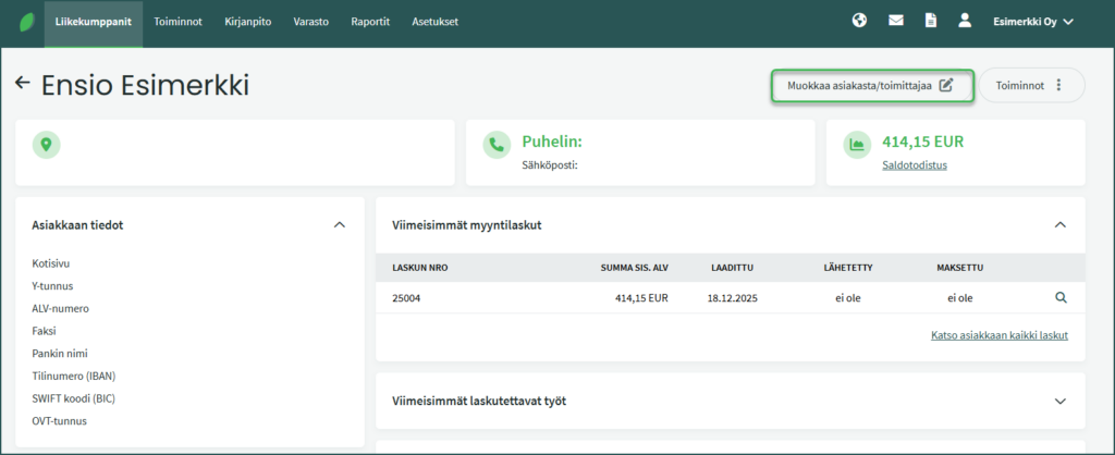 2. Valitse haluamasi asiakas ja klikkaa oikealta “Muokkaa asiakasta/toimittajaa”