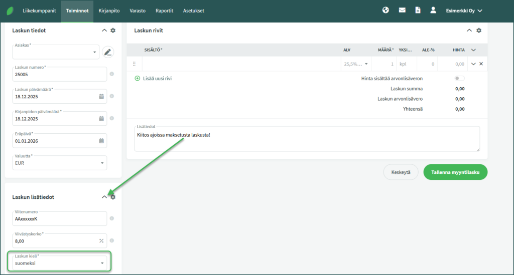 1. Voit valita laskun kielen myyntilaskua tehdessäsi kohdassa Toiminnot > Myyntilaskut > Uusi lasku.