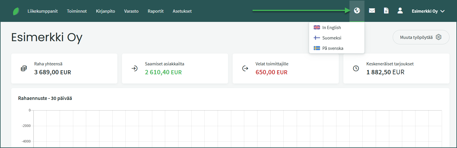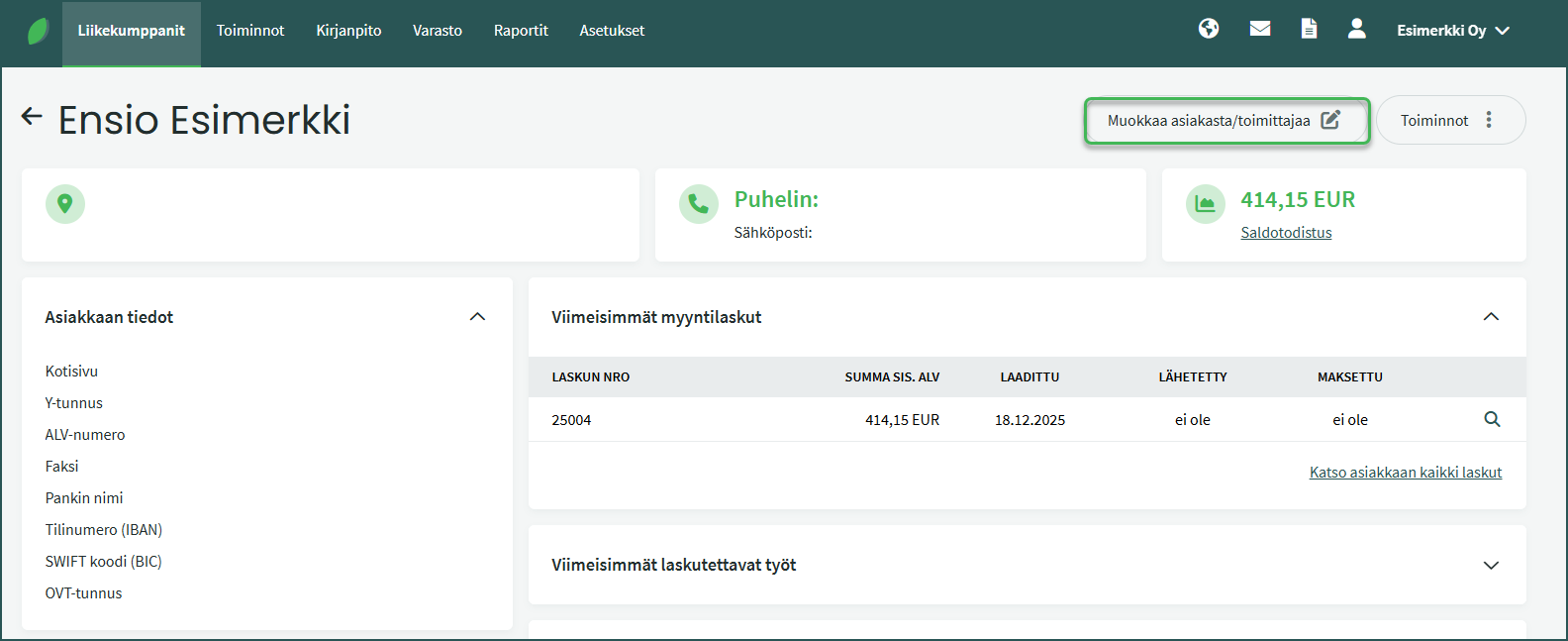 • Asiakkaan kieliasetus – Sinun ei tarvitse vaihtaa koko käyttöympäristön kieltä lähettääksesi esimerkiksi asiakkaalle englanninkielisen myyntilaskun. Voit määrittää yksittäiselle asiakkaalle kielen kohdassa Liikekumppanit > Asiakkaat ja Toimittajat > Valitse asiakas > “Muokkaa asiakasta/toimittajaa“.