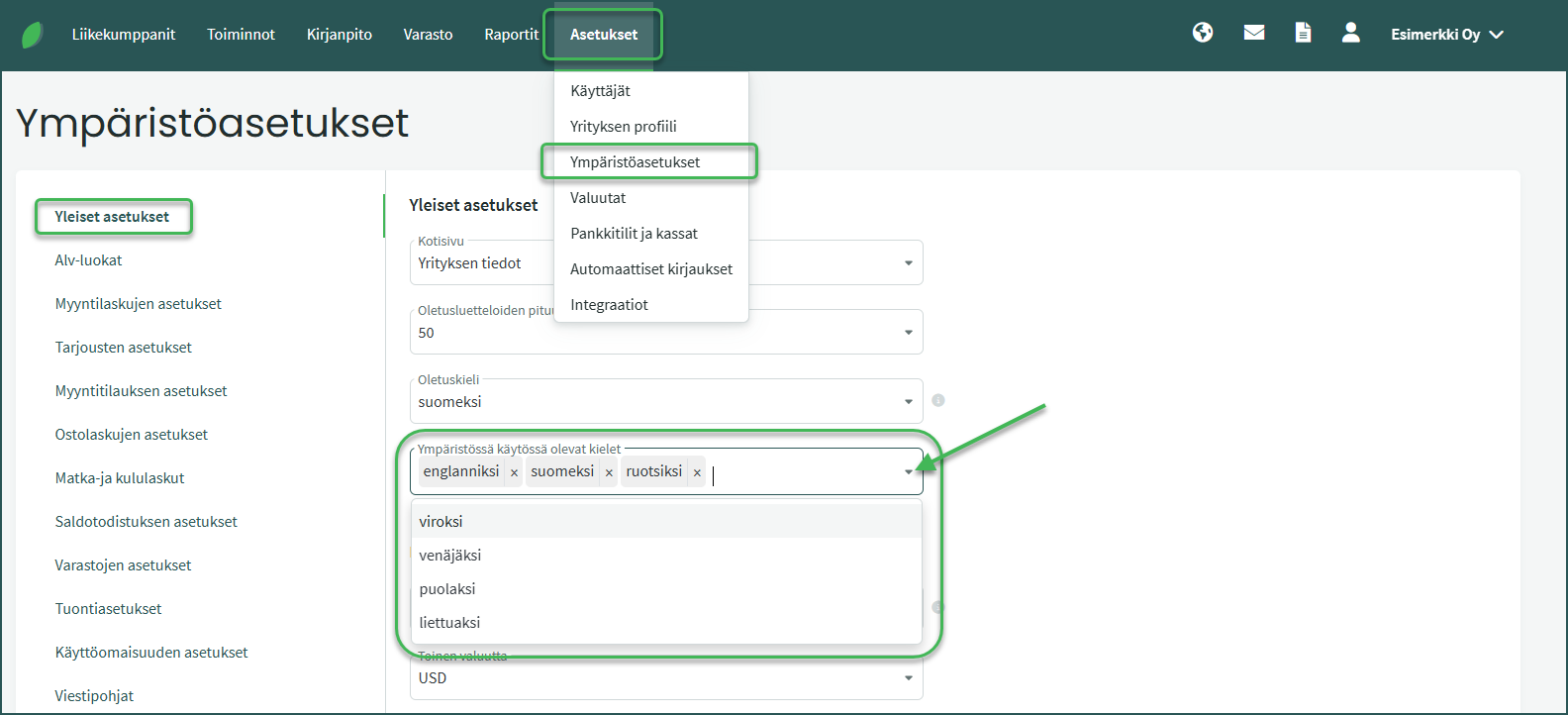 2. Voit lisätä kieliä kohdasta Asetukset > Ympäristöasetukset > Yleiset asetukset