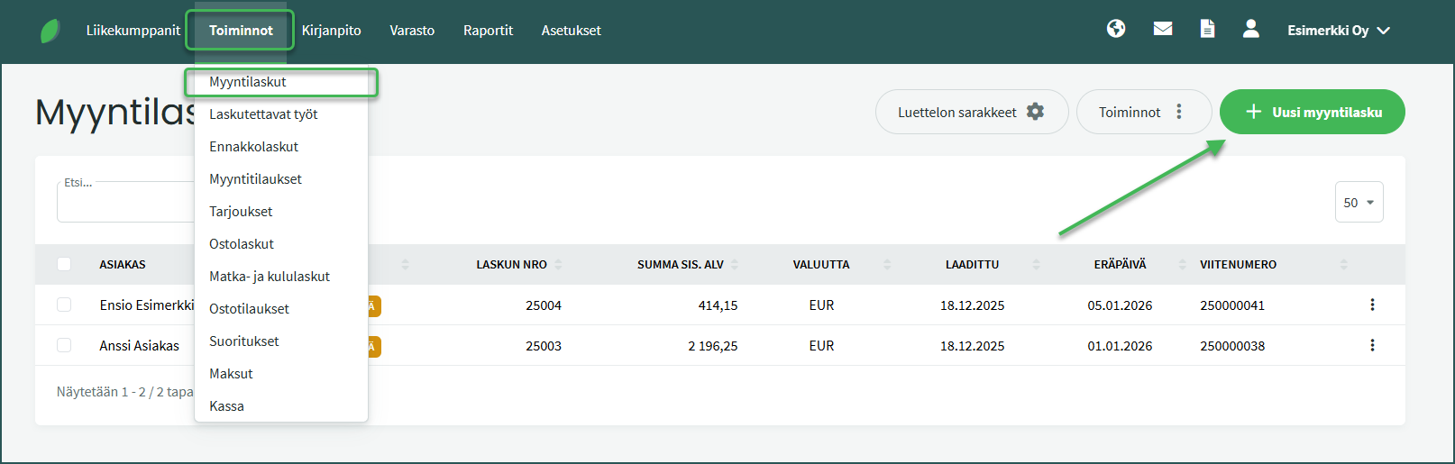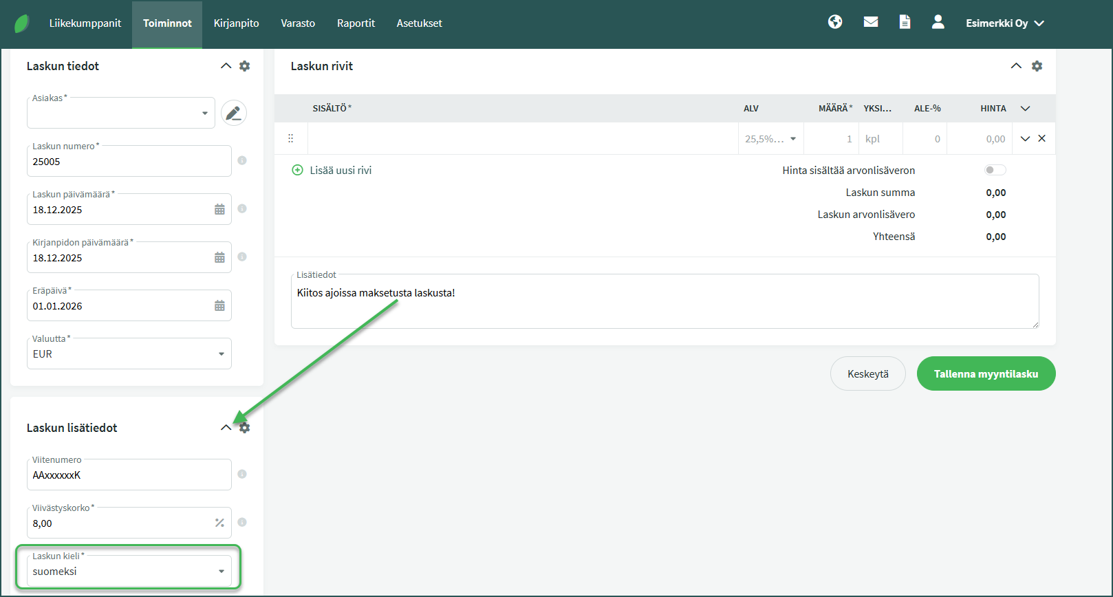 1. Voit valita laskun kielen myyntilaskua tehdessäsi kohdassa Toiminnot > Myyntilaskut > Uusi lasku.