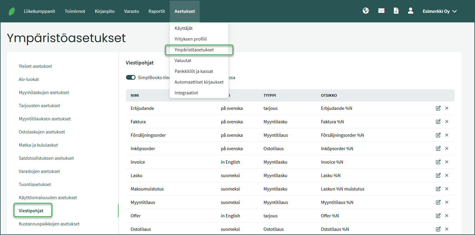 1. Voit lisätä uusia sähköpostin viestipohjia eri kielillä kohdassa Asetukset > Ympäristöasetukset > Viestipohjat.