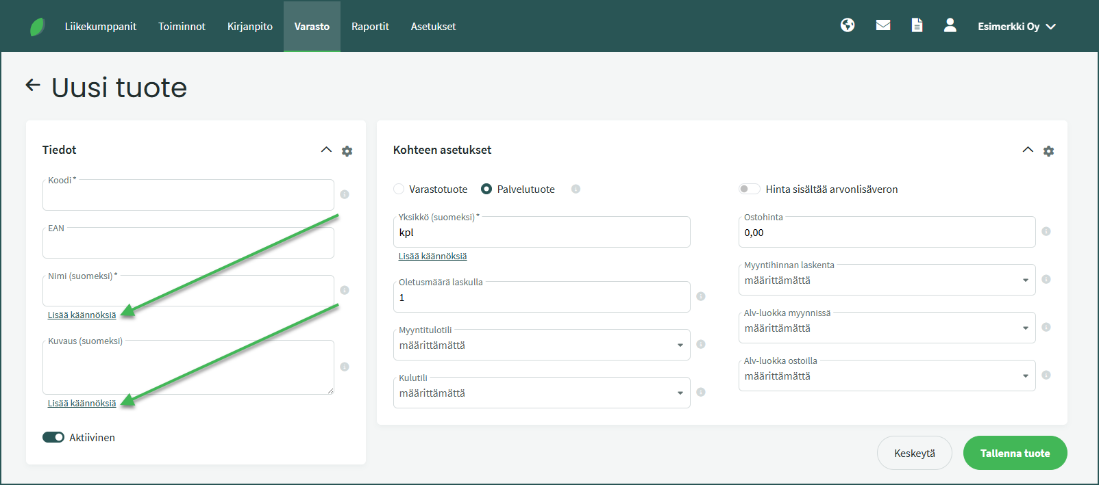 Jos käytät useita eri kieliä ja muokkaat ohjelman ominaisuuksia, sinun tulee lisätä nimet ja kuvaukset kaikilla käyttämilläsi kielillä. Esimerkiksi uutta tuotetta tai kirjanpidon tiliä lisätessä käännökset täytetään kohdassa “Lisää käännöksiä”.