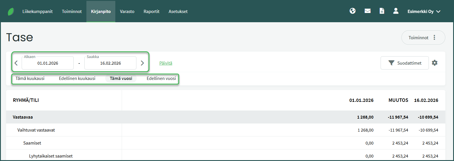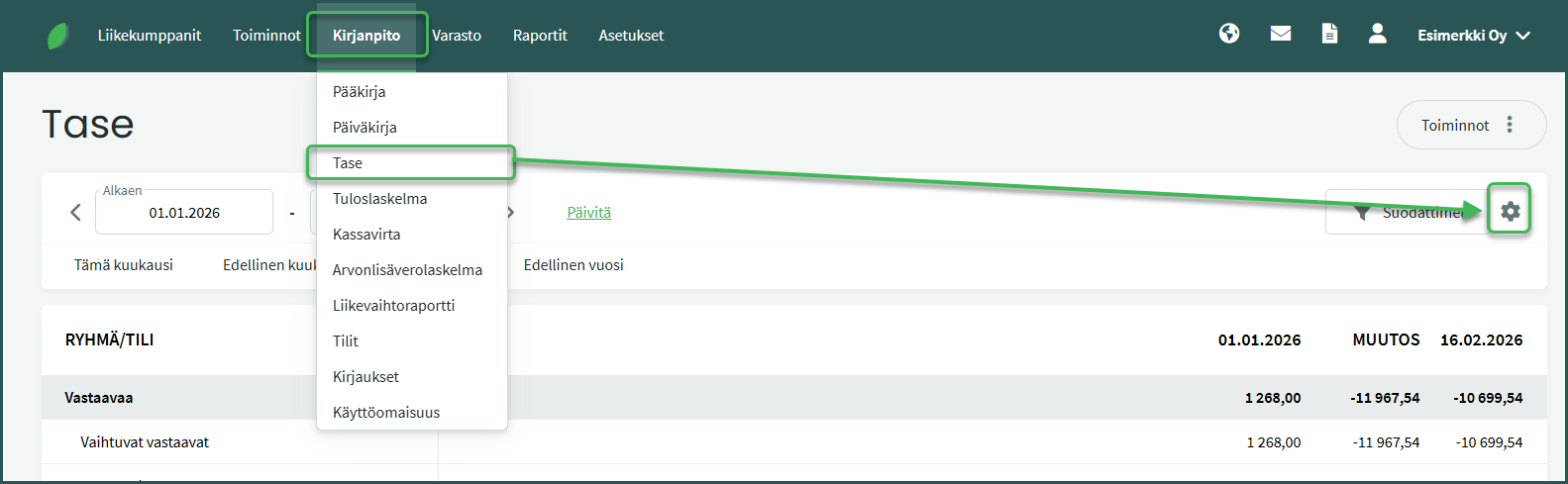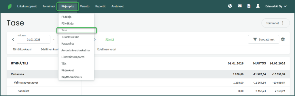 1. Löydät taseen kohdasta Kirjanpito > Tase