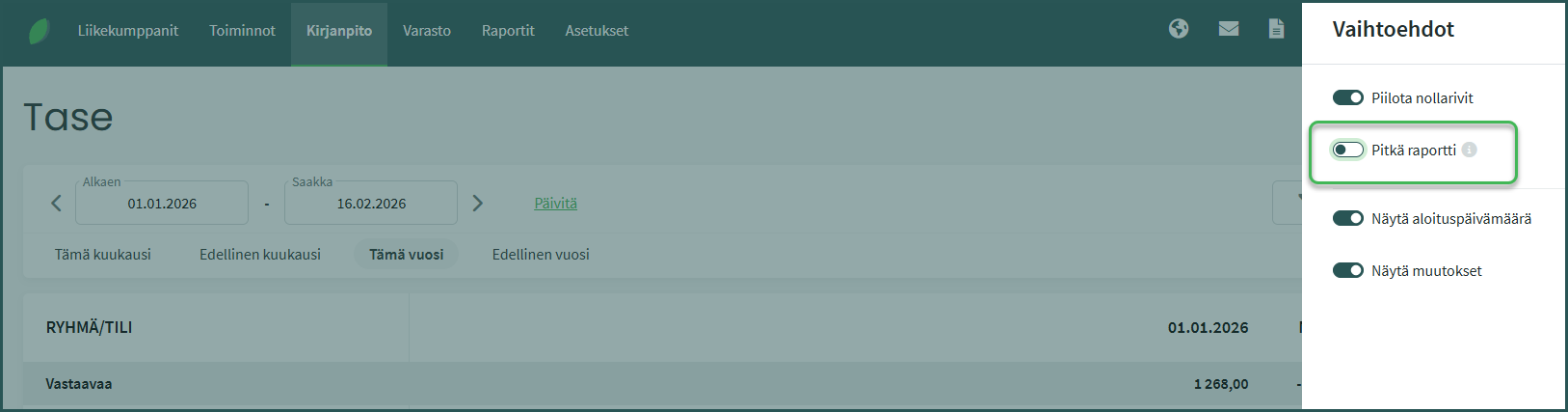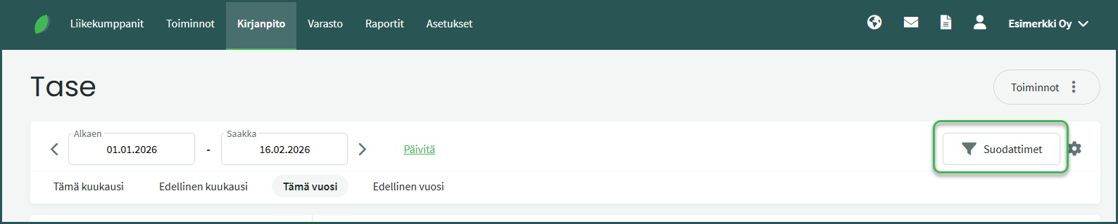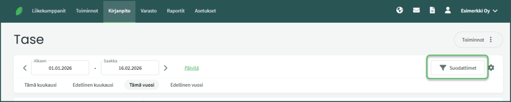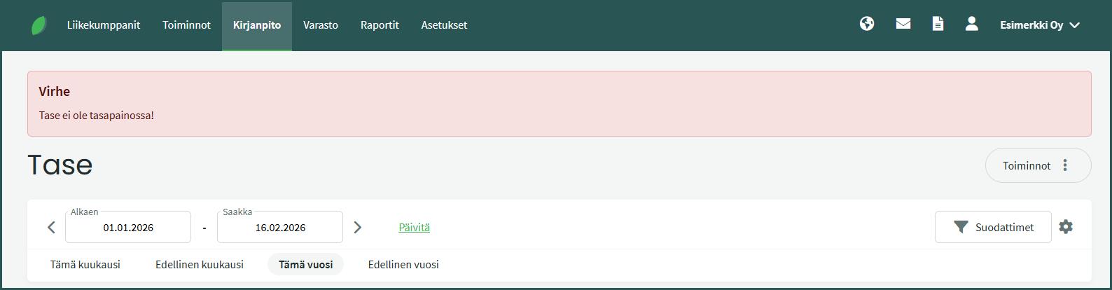 📢 Huom! Jos tase menee epätasapainoon tilikauden vaihtuessa, syy on todennäköisesti automaattisissa sulkukirjauksissa. Katso ohje niiden tarkistamiseen ja korjaamiseen täältä.
