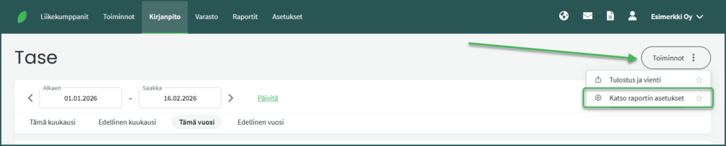 1. Voit muokata taseen asetuksia kohdasta Kirjanpito > Tase > Toiminnot > Katso raportin asetukset