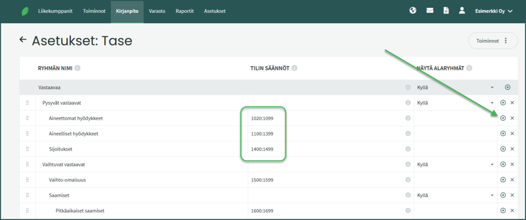 📢 Huom! Jos poistat tilikartasta tilejä tai lisäät uusia, varmista että tili on määritelty oikein taseen tai tuloslaskelman asetuksissa. Jos tiliä ei ole lisätty taseen asetuksiin, sen saldo ei näy raportilla eikä tase täsmää kyseisen tilin osalta. Oletustilikartan tilit ovat valmiiksi määritelty raporteille oikeisiin kohtiin. Alkusaldojen lisäämiseen on erikseen kirjallinen ohje täällä ja video-ohje täällä.