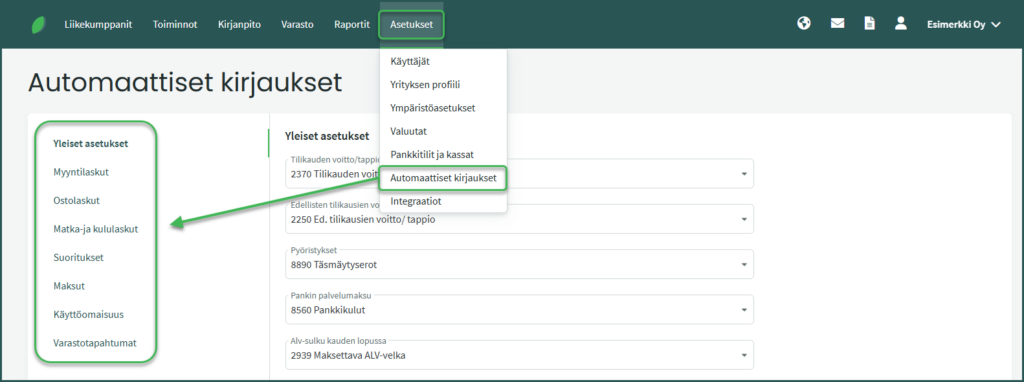 1. Näet automaattisten kirjausten tilit kohdasta Asetukset > Automaattiset kirjaukset