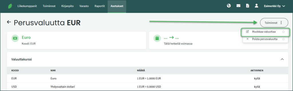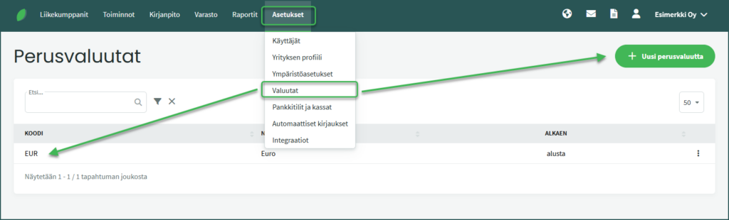 Näet sivulla oletuksena käytössä olevan perusvaluutan, jolla kirjanpito tehdään.