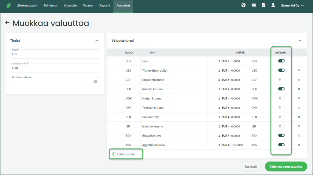Voit myös lisätä uuden perusvaluutan tarvittaessa kohdasta “Uusi perusvaluutta“.