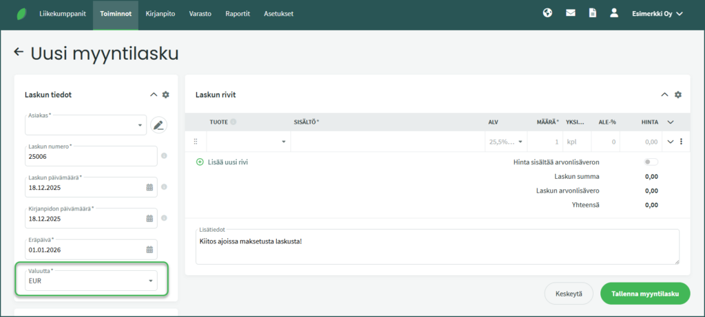 Myyntilaskulla voit valita Valuutta-kohdasta minkä tahansa aktiivisena olevan valuutan, ja ohjelma laskee summat automaattisesti oikean kurssin mukaan.