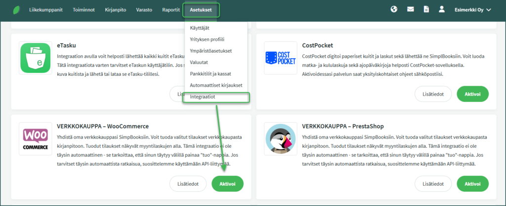 1. Saat integraation käyttöön kohdasta Asetukset > Integraatiot > WooCommerce > Aktivoi.