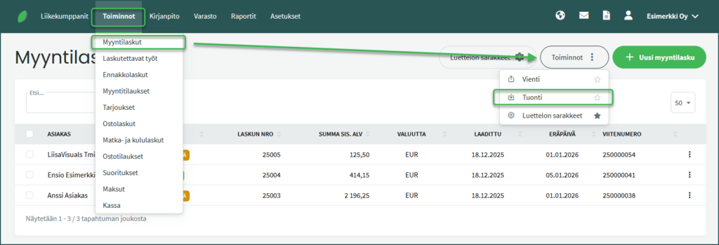 2. Kun integraatio on aktiivinen, WooCommerce-painike ilmestyy myyntilaskunäkymän Tuonti-kohtaan.