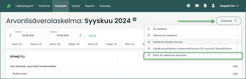 1. Tarkista asetukset kohdassa Kirjanpito > Arvonlisäverolaskelma > Toiminnot > Katso alv-laskelman asetukset.