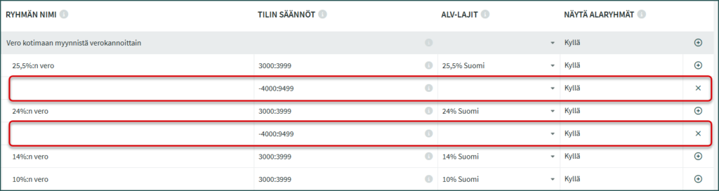 - Jos et tarvitse kyseistä alv-luokkaa ja tällainen rivi näkyy laskelmalla, poista rivi ja tallenna asetukset.