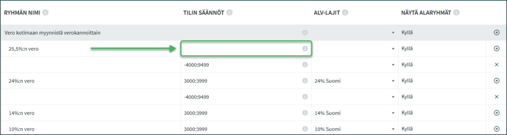 - Jos ”Tilin säännöt” on tyhjä alv-laskelman uusilla 25,5% riveillä