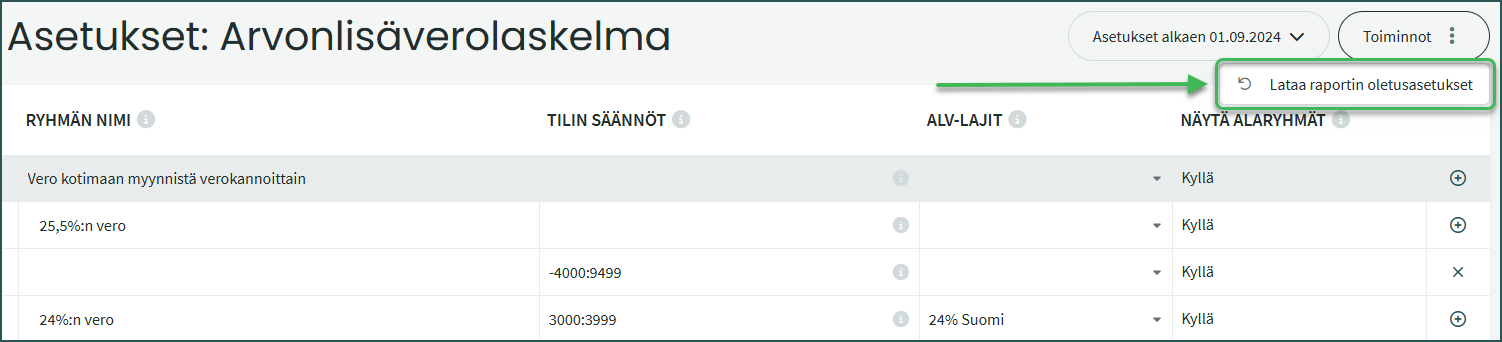 Jos et ole itse aiemmin muuttanut alv-laskelman asetuksia ja käytät ohjelman oletusasetuksia, voit helposti ladata uudet oletusasetukset käyttöösi. Tämä on suositeltavin tapa varmistaa, että arvonlisäverolaskelma toimii oikein.