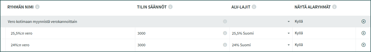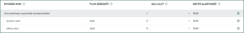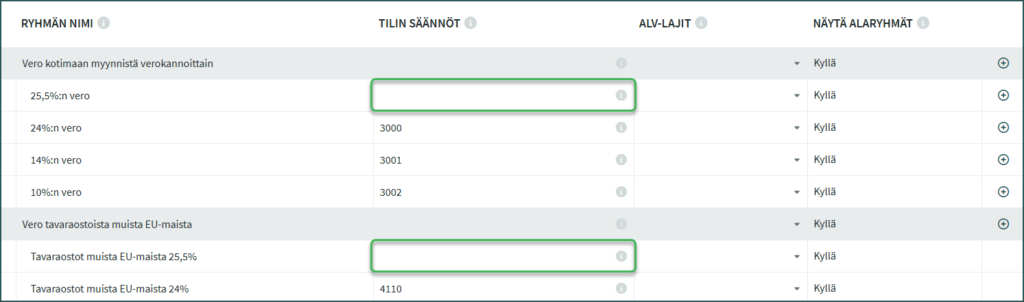 4. Jos sarake ”Tilin säännöt” on tyhjä uusilla 25,5% riveillä, asetuksia tulee päivittää.