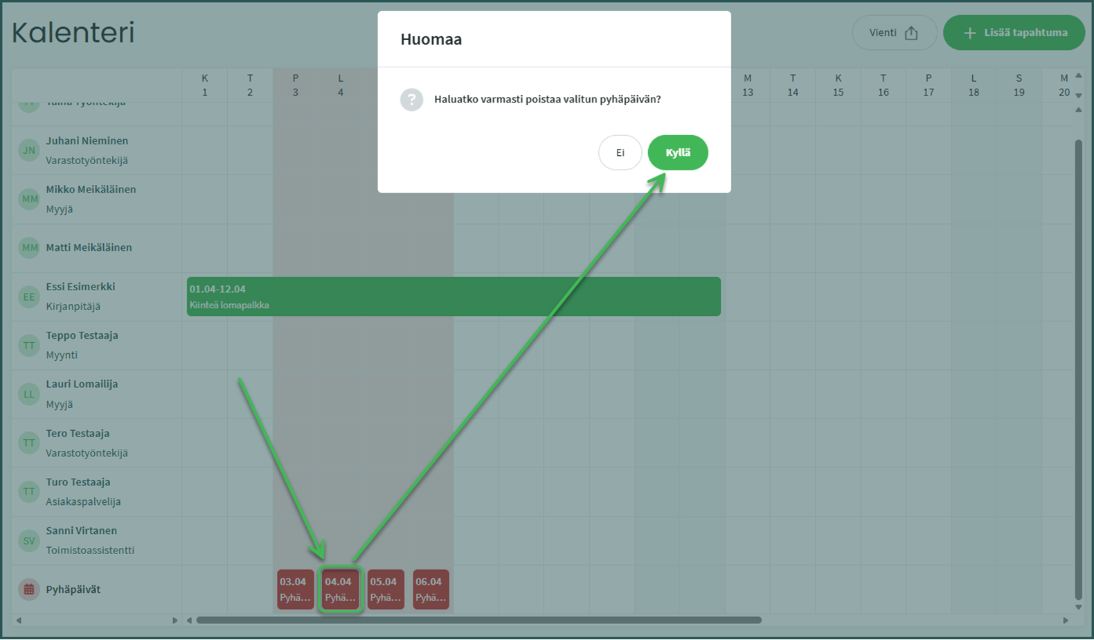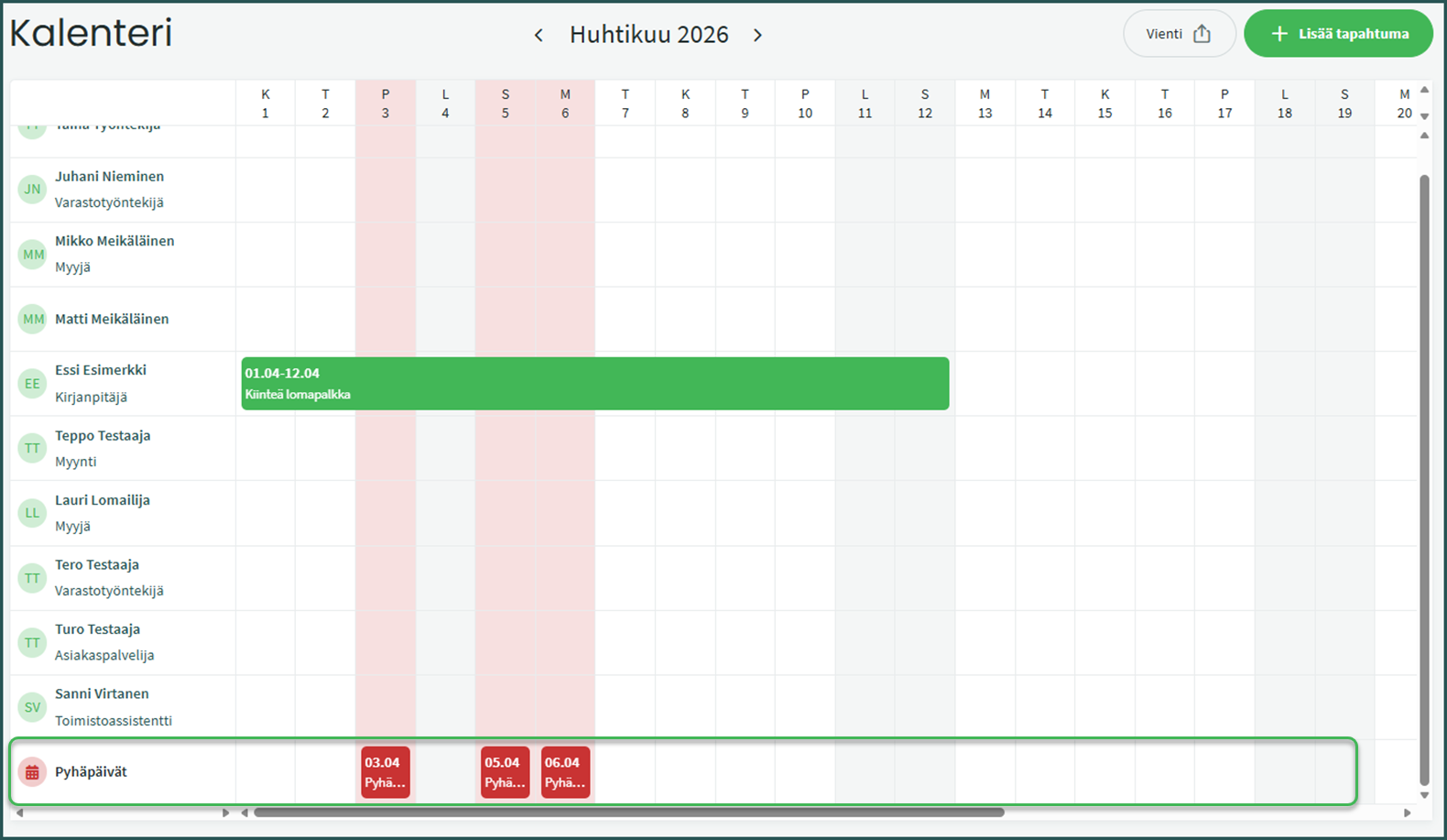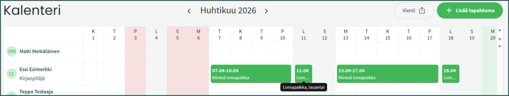 Lisää kalenteriin uusi tapahtuma kohdasta ”Lisää tapahtuma” tai klikkaamalla haluttua päivää työntekijän kohdalla kalenterinäkymässä.
